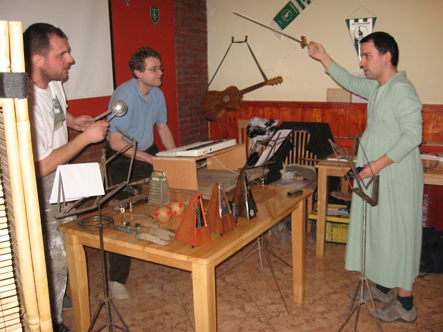 Klubu podivných varhaníků „Prolínání podivností“ pro podivnou píšťalu, podivného recitátora, blicí nástroje, pět metronomů a alto continuo.